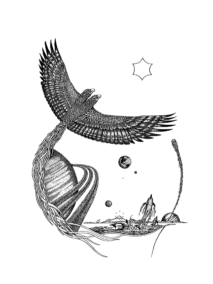 Phoenix Rising: Limited edition of 125 • 22×28 • Pointillism • Pen & Ink • 1982. Please contact the artist for purchase information. Info@dwij.org